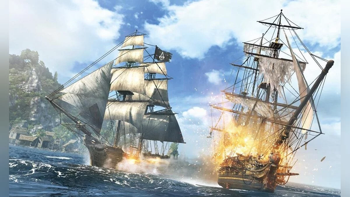 Кадр с морским сражением между двумя кораблями иллюстрирует главу «Туманный Альбион в Средние века». Если присмотреться, то на судне справа можно увидеть черный флаг с логотипом ассасинов.