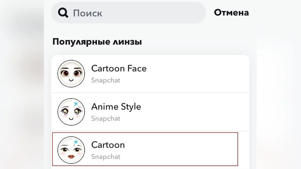 Фильтр также можно найти в разделе поиска, который находится справа. Просто откройте его и напишите Cartoon.