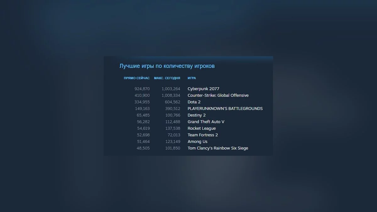 При этом одновременный онлайн сегодня превысил миллион активных пользователей, а Cyberpunk 2077 вышел по этому показателю на первое место. При этом многие пользователи жалуются на «падение» игры при запуске.