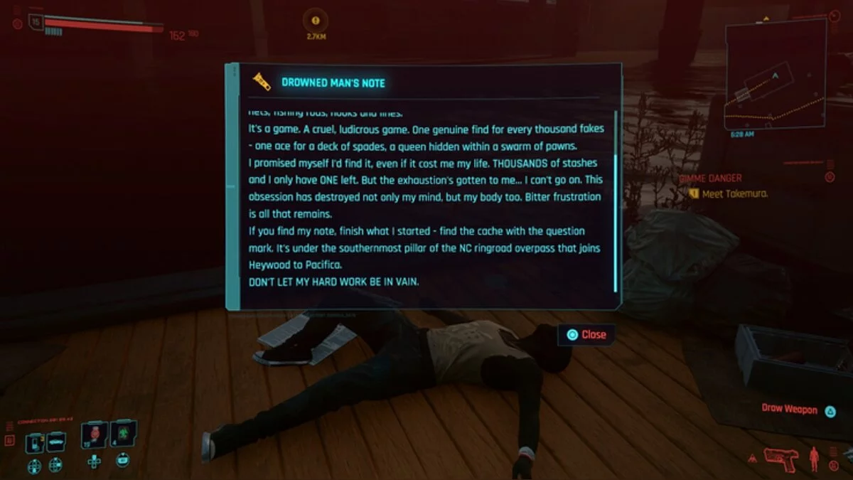 В этом месте лежит мертвец с любопытной запиской. В ней говорится, что мужчина вскрыл уже «тысячу тайников, отмеченными знаками вопроса». Те, кто играл в The Witcher 3, вспомнят многочисленные схроны с контрабандой, которые обычно находятся в воде.
