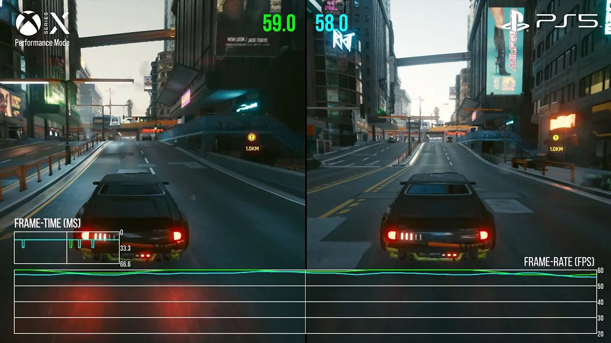 Похоже, что «узким местом» для PS5 является процессор, поскольку SSD и графики вполне хватает. Это проявляется во время езды по городу на высокой скорости, где кадровая частота падает до 50 FPS.