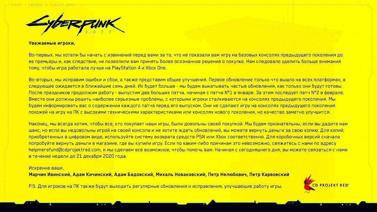 По мнению Клепека, японская корпорация была не готова к такому количеству запросов на возврат. В рамках конференц-колла с инвесторами менеджеры CD Projekt признали, что никакого специального соглашения по возвратам с Microsoft и Sony у них нет. Из-за этого и начались отказы в возмещении. Если всё же хочется вернуть деньги, то писать надо разработчикам. К слову, там же президент компании рассказал, почему игра плохо функционирует на PS4/Xbox One.