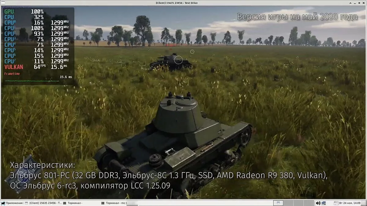 Как отмечается, показатель FPS в War Thunder держался на уровне выше 60 кадров в секунду при максимальных настройках графики. CRSED: F.O.A.D. и Enlisted выдавали порядка 30 FPS. Для тестирования использовалась рабочая станция «Эльбрус 801-РС» с видеокартой AMD Radeon R9 380, процессором Эльбрус-8С (1,3 ГГц), 32 ГБ ОЗУ DDR3 и ОС «Эльбрус 6».