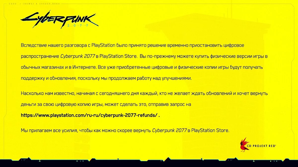 Между тем, разработчики заявили, что работают над скорейшим возвращением Cyberpunk 2077 в PS Store. Не исключено, что в скором будущем выйдет переработанная версия.