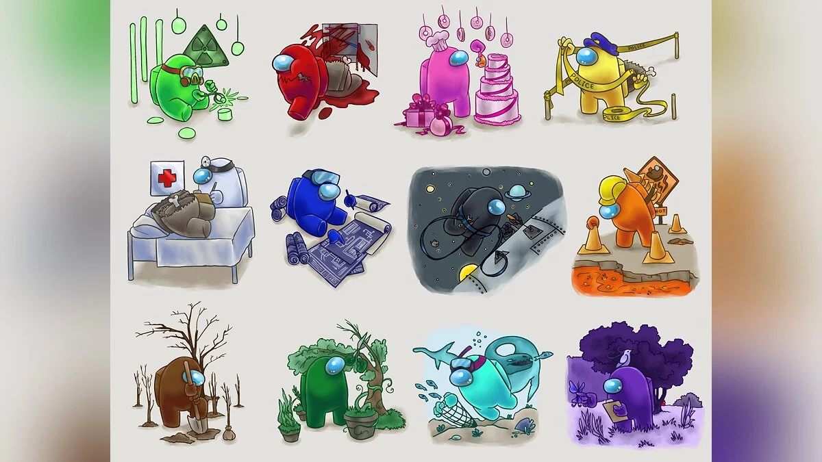 Хотя Cyberpunk 2077 сейчас не сходит со страниц новостных изданий (в том числе VGTimes.ru), геймеры не забывают и о других играх. Так, пользователь Poodle_Apocalypse опубликовал на Reddit милый фан-арт, где показал всех космонавтов из «космической Мафии» Among Us. При этом там каждый занимается делом под цвет своего скафандра.