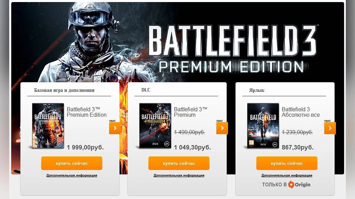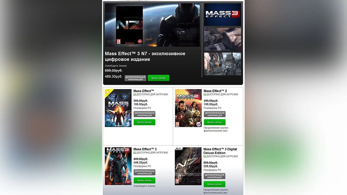 В продаже можно встретить Battlefield 3 Premium по цене 1 049.30 руб., Mass Effect 3 N7 «Эксклюзивное цифровое издание» по цене 489.30 руб., Command & Conquer The Ultimate Collection 499.50 руб.