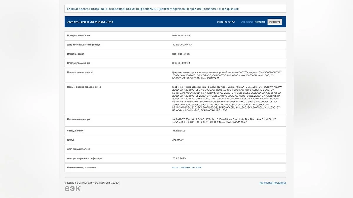 В базе данных Евразийской экономической комиссии (ЕЭК) появилась новая запись, которая указывает на подготовку большого перечня видеокарт GeForce RTX 3080 Ti и RTX 3060. Их выведет на рынок компания Gigabyte.
