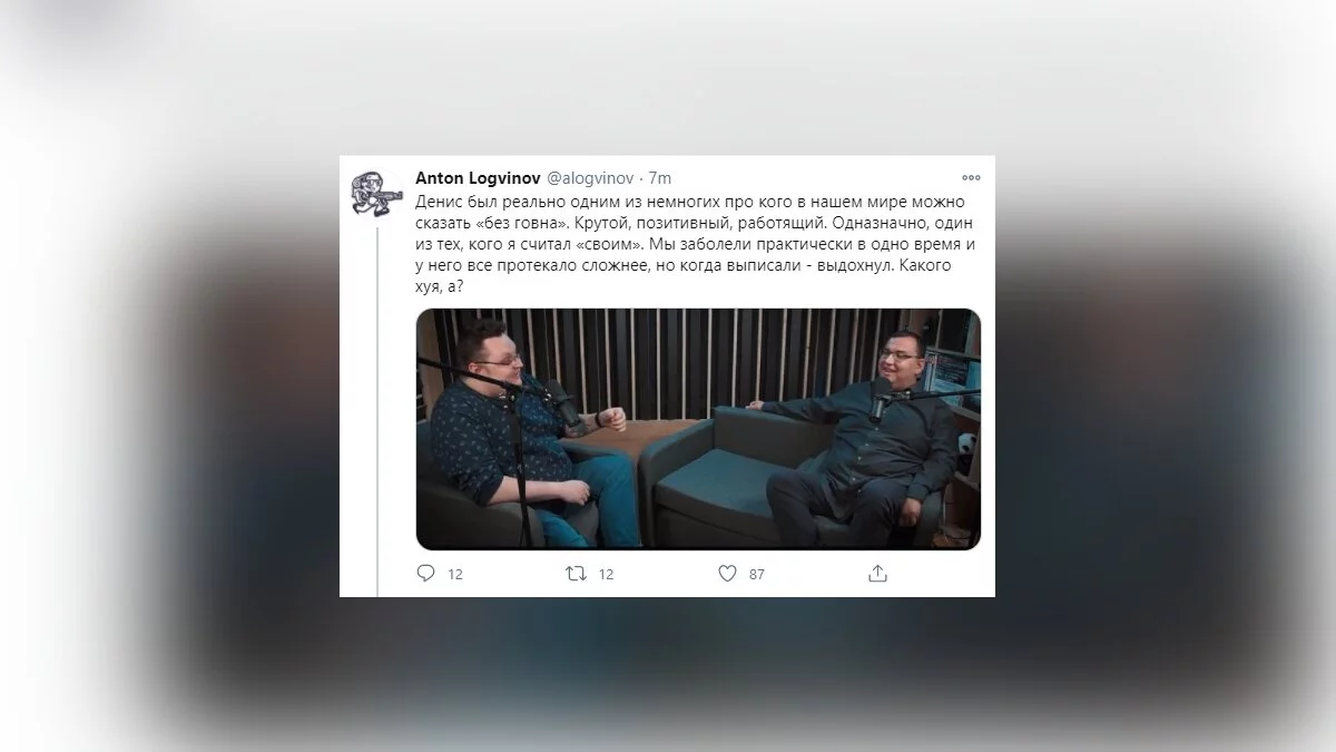 Другой известный блогер Антон Логвинов прокомментировал смерть коллеги в Twitter.