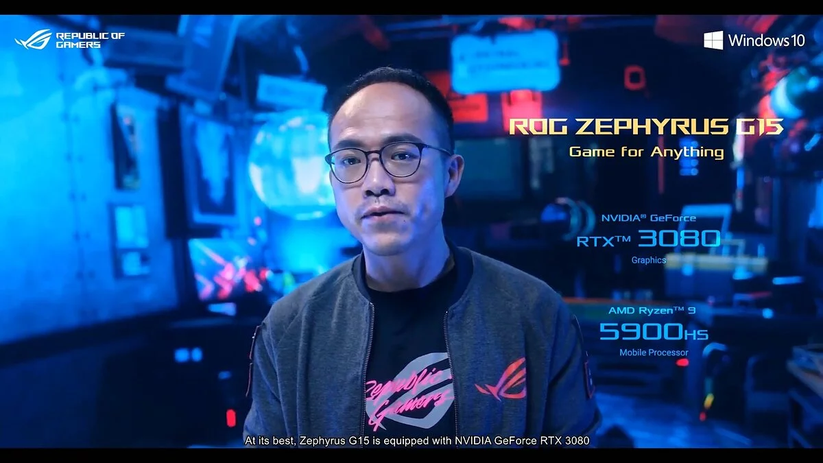 Внутри установлен процессор AMD Ryzen 5900HS, графика RTX GeForce 3080, до 32 ГБ памяти DDR4-3200 и до двух накопителей SSD NVMe по 512 ГБ или 1 ТБ. Есть батарея на 90 Вт·ч. Также присутствуют все стандартные для лэптопа разъёмы — DisplayPort 1.4 и HDMI 2.0b, порт 3,5 мм, два USB 3.2 G2 Type-C и два USB 3.2 G1 Type-A. Есть поддержка Wi-Fi 6 и BT 5.0.