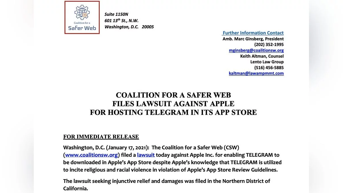 Американская некоммерческая организация «Коалиция за более безопасный интернет» (Coalition for a Safer Web) подала иск против компании Apple и потребовала удалить мессенджер Telegram из App Store.