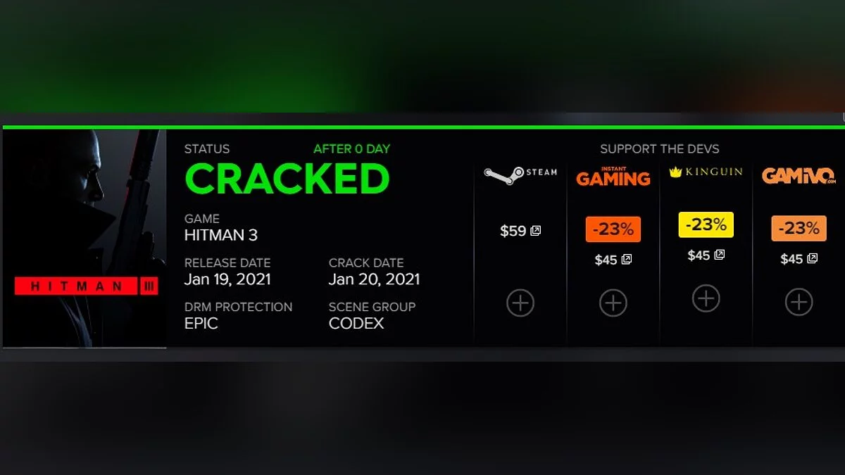 Позавчера, 19 января, состоялся релиз Hitman 3. А вчера хакеры уже обошли защиту игры. Об этом сообщает ресурс CrackWatch, который отслеживает активность хакерских групп, занимающихся обходом защиты в играх.
