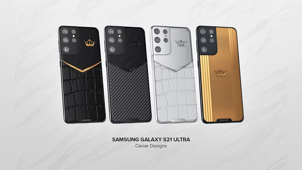 Российская компания Caviar представила пять новых эксклюзивных моделей Samsung Galaxy S21 Ultra. Это версии, выполненные из дорогих материалов — белой и чёрной крокодиловой кожи, золота, титана, углеродного волокна и так далее. Стоимость начинается от 359 тысяч рублей, а старшая модель стоит 1.3 миллиона.