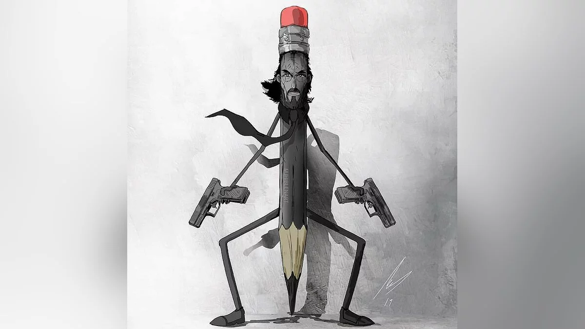 Рисунки пародируют известные кинофильмы: от «Матрицы» до «Логана» и «Джона Уика».