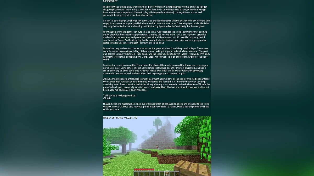 Если вы хотя бы слышали об игре Minecraft, то наверняка знаете историю о Хиробрине. Этот персонаж появился много лет назад в качестве городской легенды и интернет-страшилки. Он выглядит в игре как Стив, но при этом у него белые глаза. Персонажа описывают как некоего наблюдателя, который следит за игроком, исчезает при приближении или же заманивает в ловушку.
