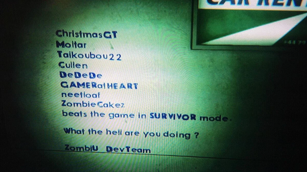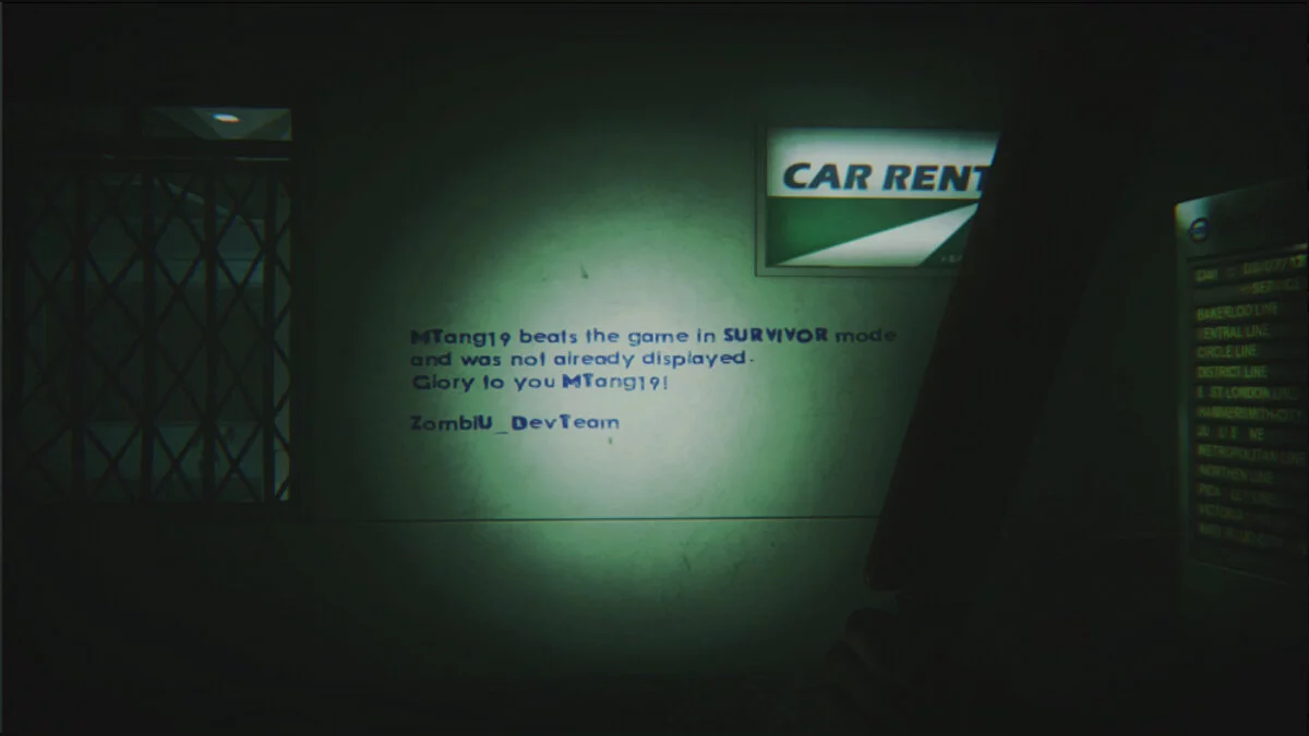 Тем не менее, уже девять игроков ZombiU смогли стать победителями в этом режиме. В награду за столь умелое сражение с зомби, Ubisoft оставила два скрытых сообщения в игре. В одной из локаций на стене можно найти список из 8-ми ников и поздравления от компании. Где-то там рядом еще одно сообщение, в котором упомянуто имя 9-го выжившего, о котором по ошибке забыли.