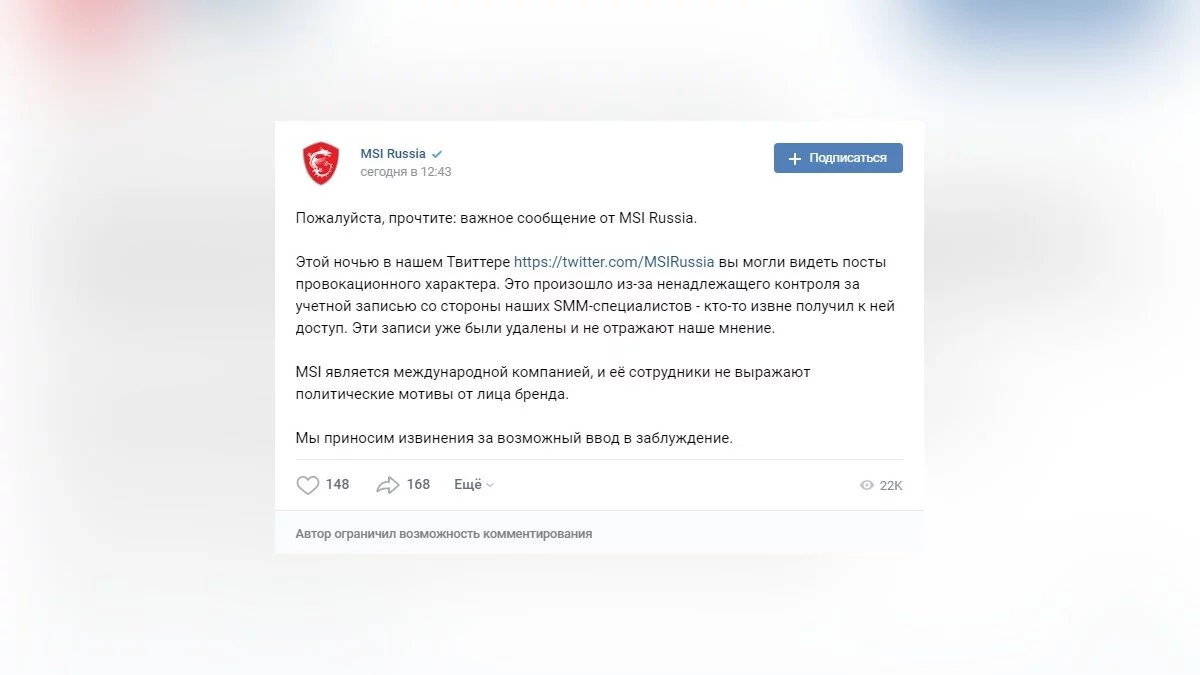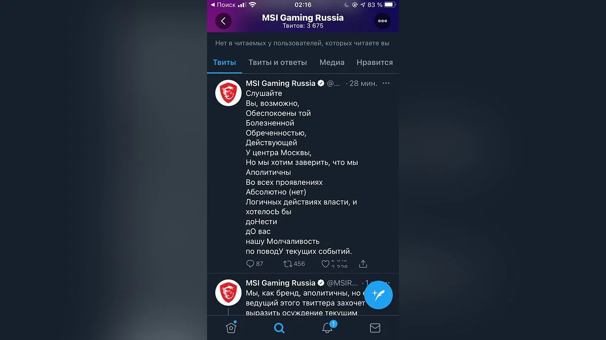 В ночь на 3 февраля российский Twitter-аккаунт компании MSI опубликовал несколько постов в поддержку Алексея Навального, которого приговорили к 3,5 годам лишения свободы по делу «Ив Роше».