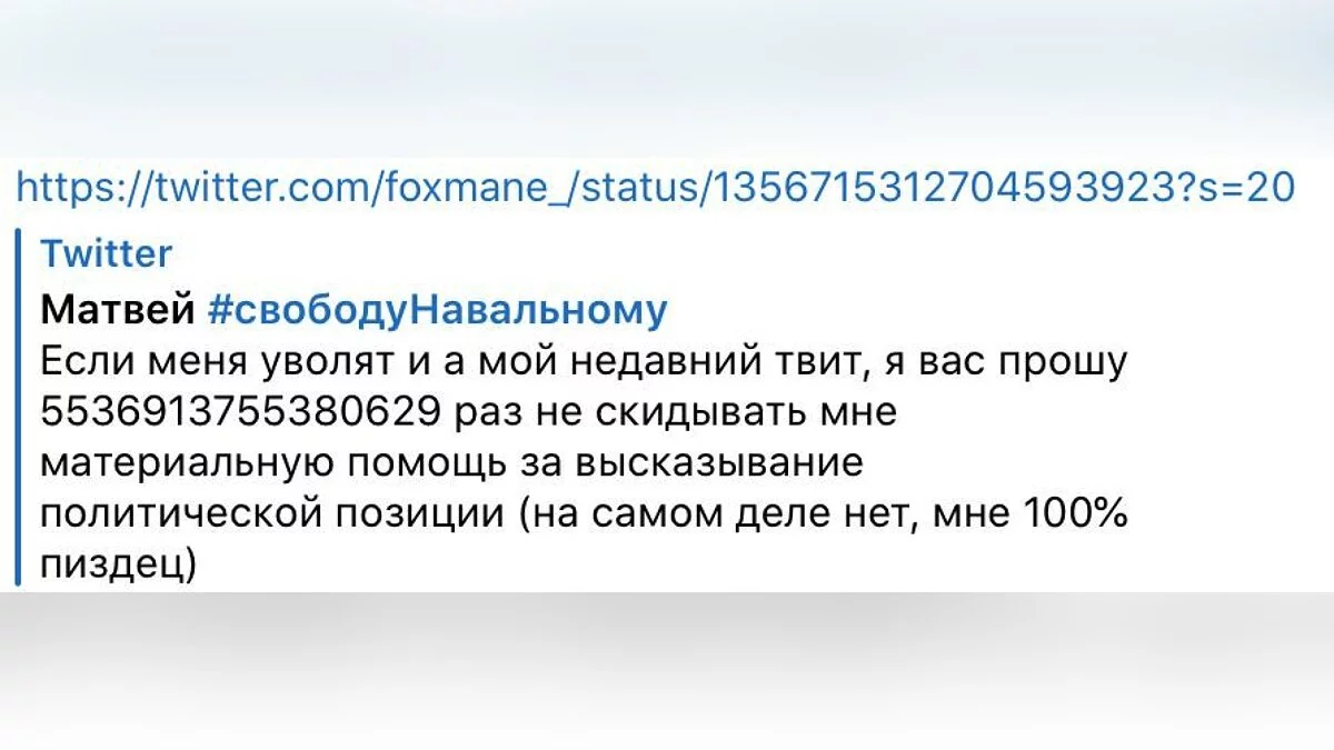 В первом сообщении ведущий аккаунта заявил, что компания хочет «донести молчаливость по поводу текущих событий» — при этом заглавные буквы в посте образуют сообщение «Свободу Навальному».
