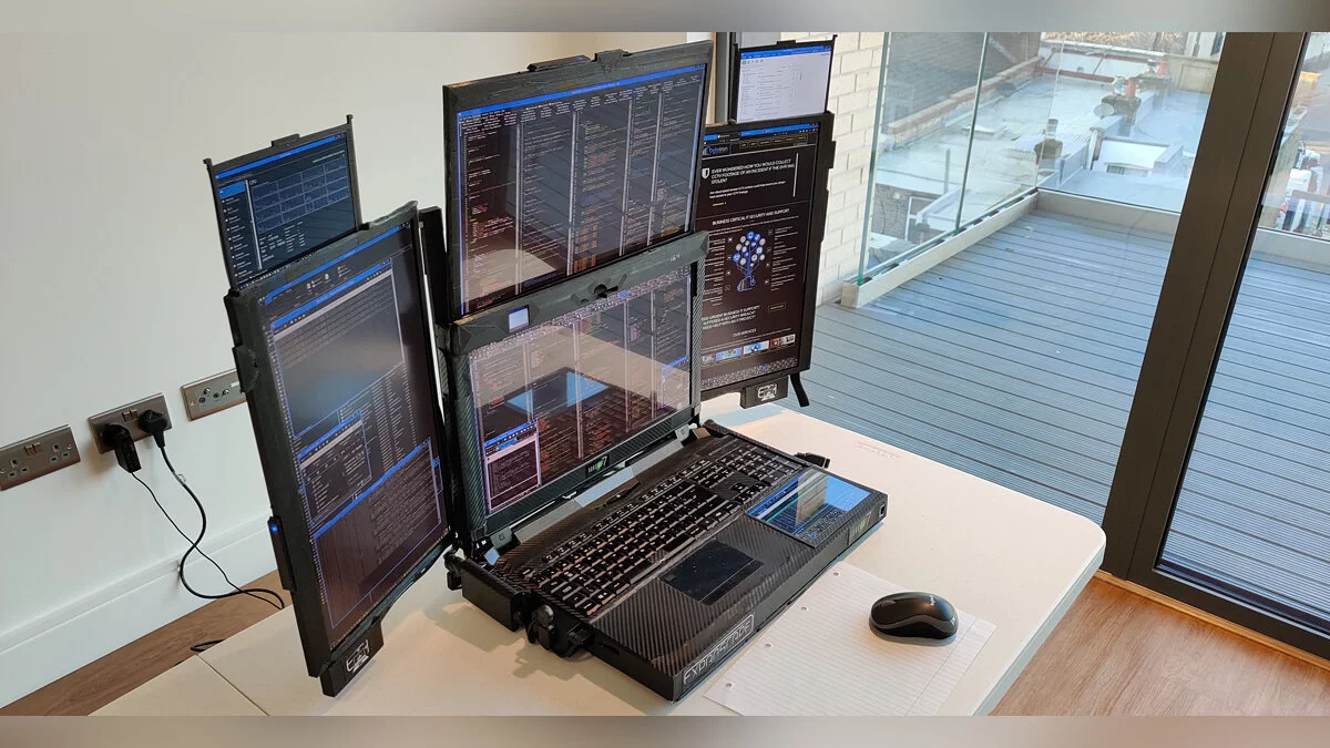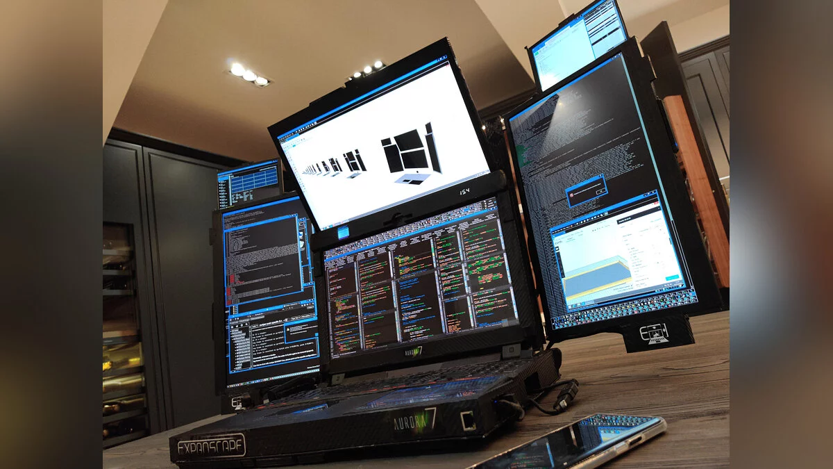 Похоже, что киберпанк действительно наступает. Компания Expanscape разработала «мобильную рабочую станцию» Aurora 7, которая оснащена семью встроенными экранами. Так что подключать внешние дисплеи не нужно (но можно).