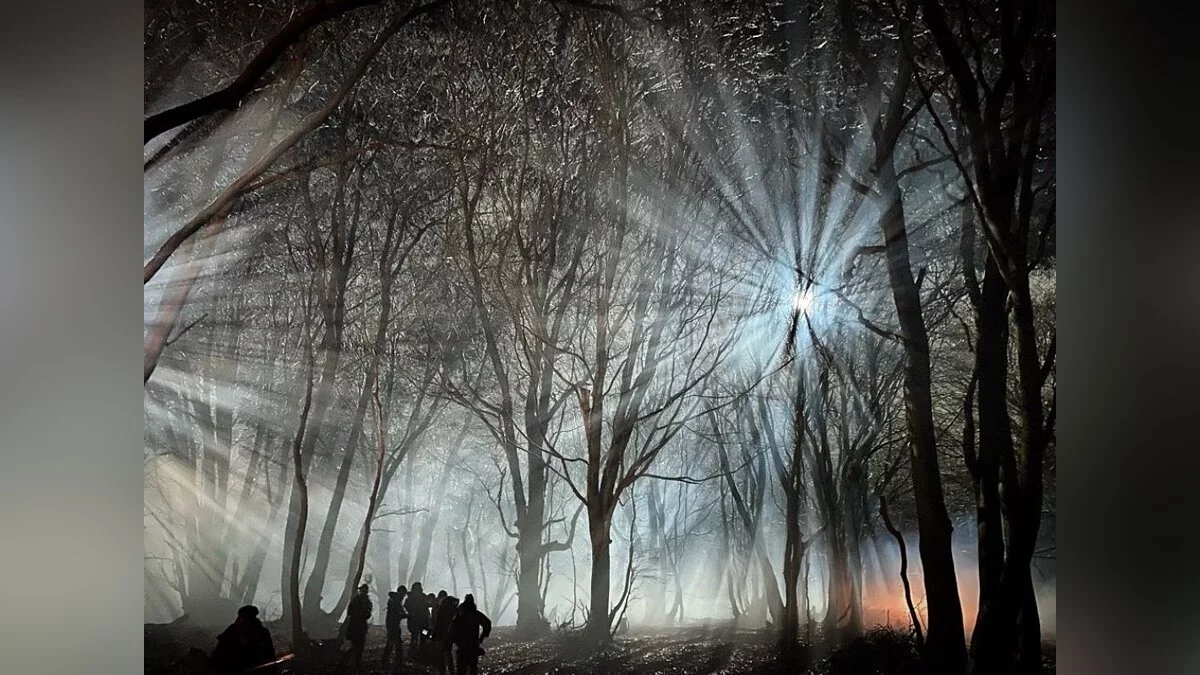 На фотографии изображена группа людей на фоне очень атмосферного леса.