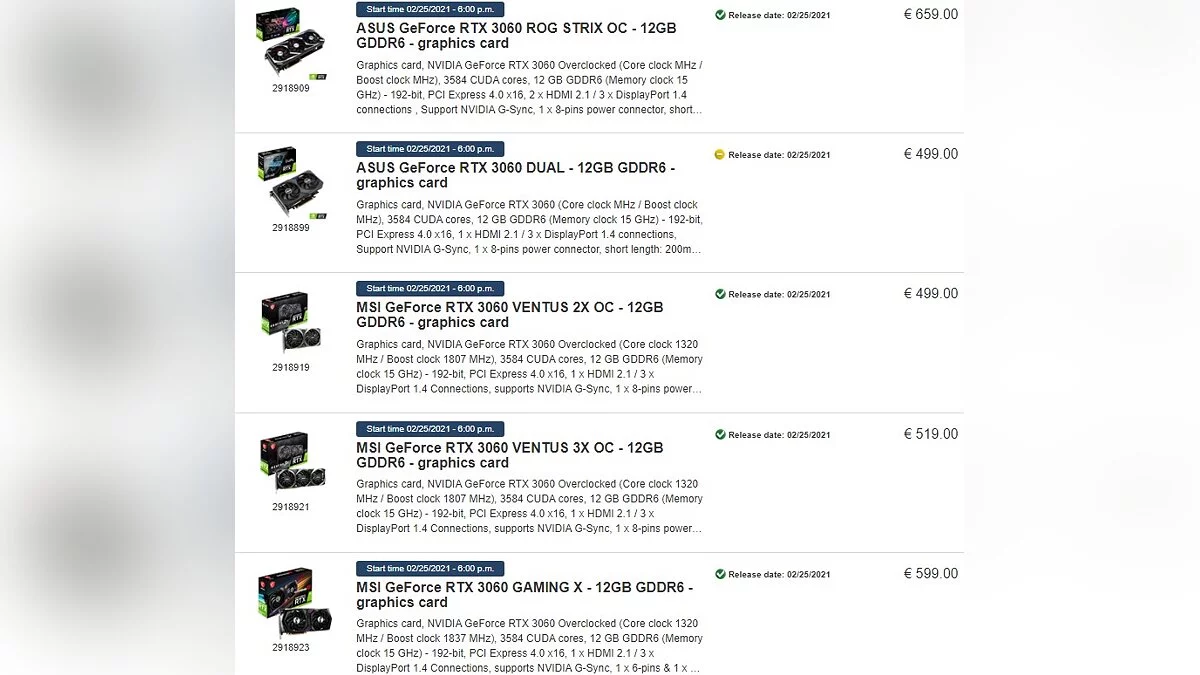 Через две недели, 25 февраля, в продажу поступят видеокарты GeForce RTX 3060. Их рекомендованная цена составляет 330 долларов/евро, однако европейские ретейлеры уже начали накручивать стоимость. Сеть магазинов ProShop установила цены на уровне от 500 евро и выше. Есть варианты и дороже — 650 евро и более.