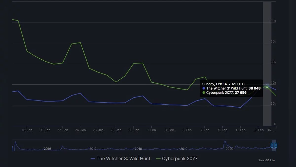 За последние сутки пиковый онлайн в «Ведьмаке» составил 34 056 человек, в то время как «Киберпанк» мог похвастаться 28 347 игроками. Вряд ли спад интереса связан с багами и оптимизацией: мало какая сюжетная одиночная игра способна оставаться популярной столь долгий период.