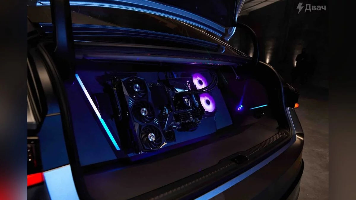 В багажнике разместили мощный игровой PC на базе процессора AMD Ryzen 9 5950X, материнской платы MSI MPG X570 Gaming Pro Carbon и видеокарты MSI GeForce RTX 2080. Помимо этого, есть дым-машина, лазеры и светодиоды. Изогнутый монитор с диагональю 27 дюймов и разрешением 4K расположен справа от водителя. Там же находится геймерская зона. Для игры есть клавиатура, мышь и фирменный геймпад, который напечатан на 3D-принтере.