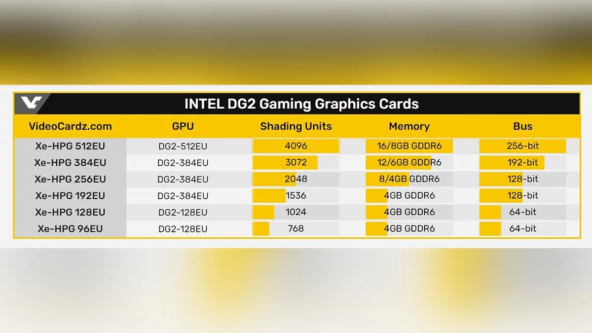 По данным VideoCardz, компания Intel готовится выпустить целую линейку игровых настольных дискретных видеокарт. Причём между ними будет существенная разница. Если точнее, то будут версии с 64-разрядной шиной и 768 шейдерными ядрами, а также модели на 256 бит и 4096 ядер. Объёмы памяти будут варьироваться от 4 до 16 ГБ GDDR6.
