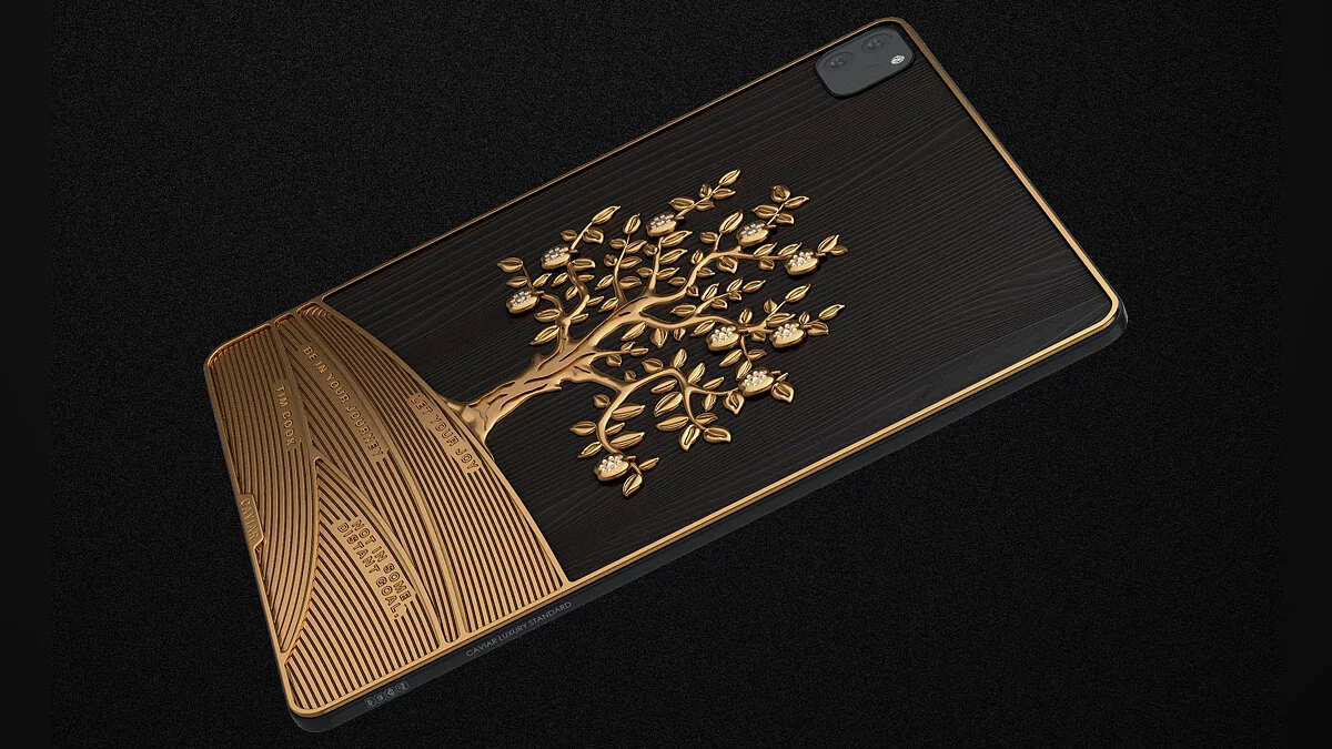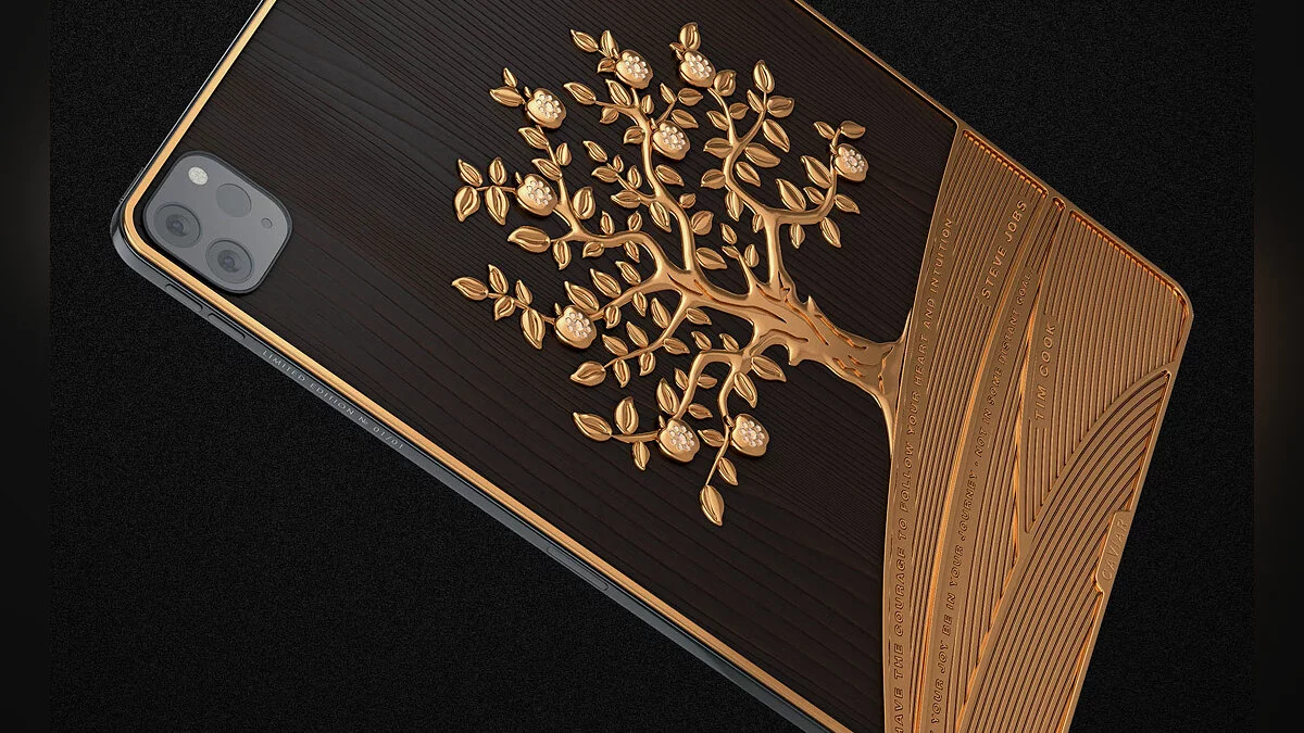 Самым дорогим устройством оказался iPad Pro Grand Apple iPad Pro Grand Apple, в отделке которого использовалась древесина редкой яблони. На задней панели есть золотая яблоня из металла 750-й пробы с 81 бриллиантом. Всего на инкрустацию ушло более килограмма золота.
