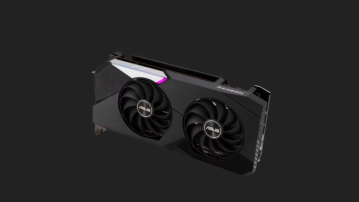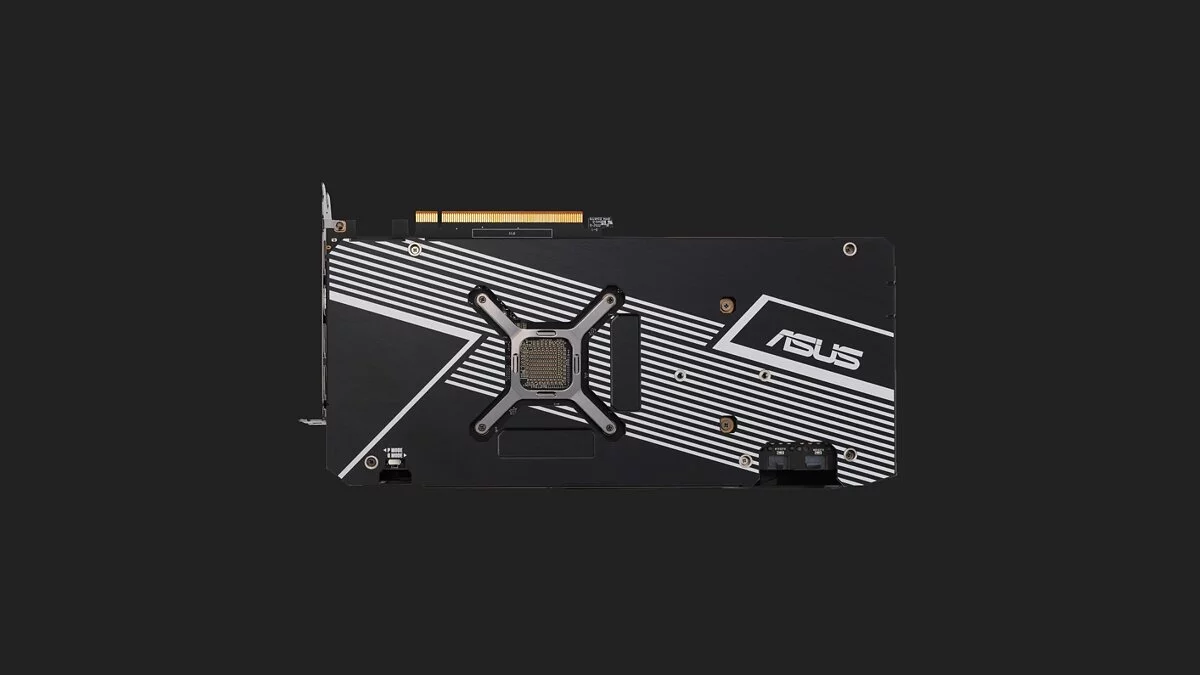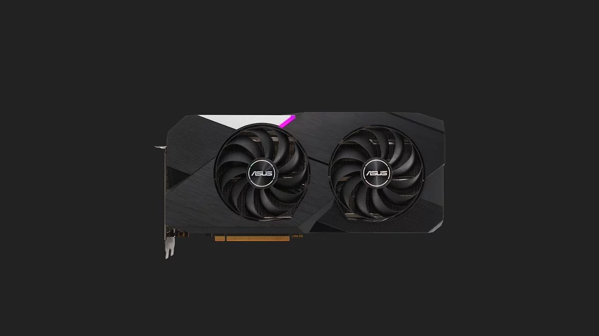 RX 6700 XT от ASUS Dual — самая лаконичная из сегодняшней тройки. Она имеет уже два вентилятора, усилительную пластину и подсветку. Как и другие модели, при незначительных нагрузках вентиляторы видеокарты полностью останавливаются.