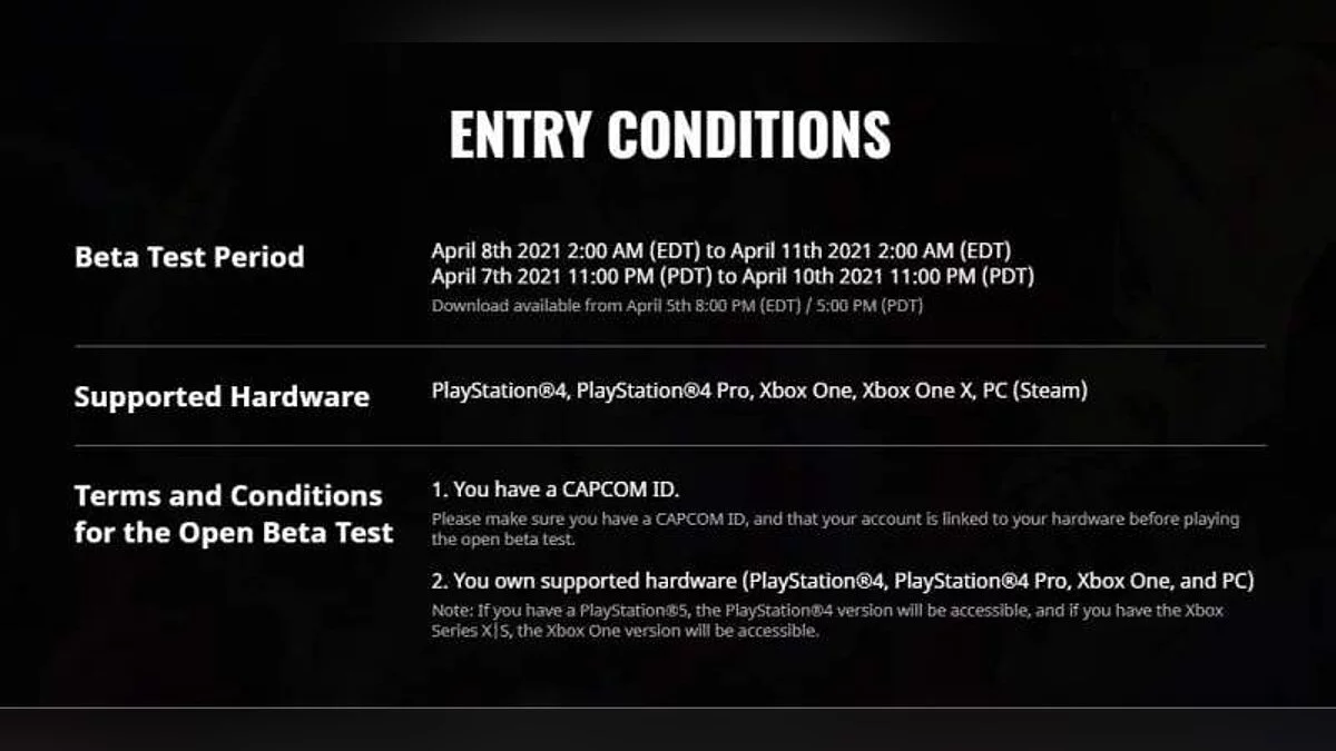 Бета стартует утром 8 апреля и продлится до 11 числа. Клиент для игры можно будет загрузить с 6 апреля. Тест будет проходить на PS4, PS5, Xbox One, Xbox Series и PC. При этом игрокам нужен будет аккаунт Capcom ID.