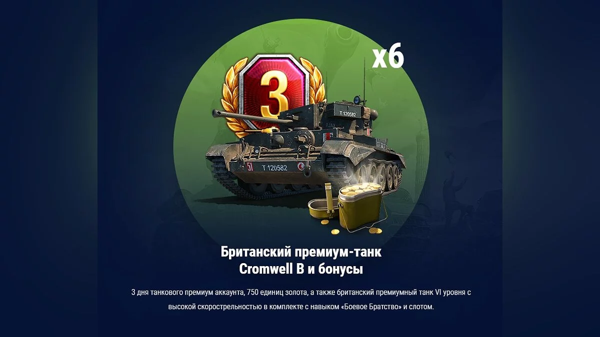 - Британский премиум-танк VI уровня Cromwell B и игровые бонусы (x6);