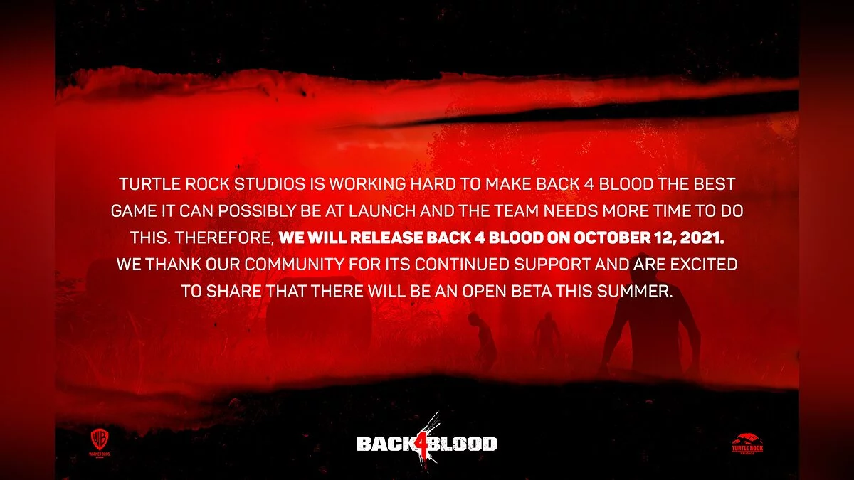 Turtle Rock Studios работает в поте лица, чтобы выпустить Back 4 Blood в наилучшем качестве, какое только возможно на релизе. Поэтому мы просим еще немного времени. Back 4 Blood 12 выйдет октября. Мы благодарим наше сообщество за поддержку и рады сообщить, что открытая бета начнется этим летом.