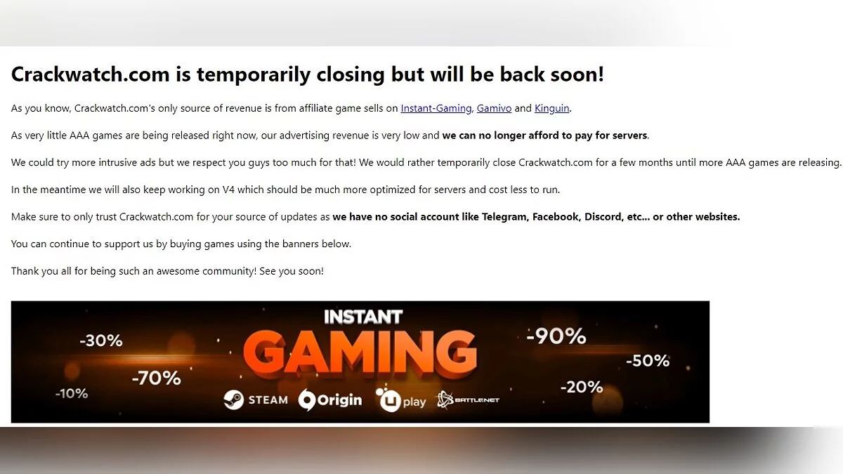 Владельцы Crackwatch попросили пользователей покупать игры у магазинов-партнёров, что может в будущем решить проблему.