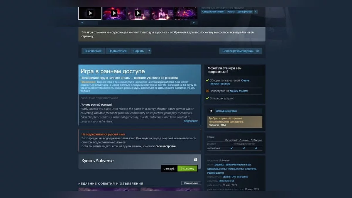 Самая дорогая порно-игра Subverse подорожала в Steam