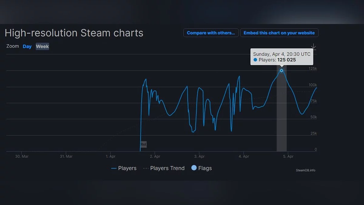 Вышедший 1 апреля кооперативный лут-шутер Outriders (наш обзор) пользуется невероятной популярностью в Steam. По данным SteamDB, вчера новинка от студии People Can Fly поставила очередной личный рекорд, собрав 125 тысяч игроков онлайн в сервисе Valve.