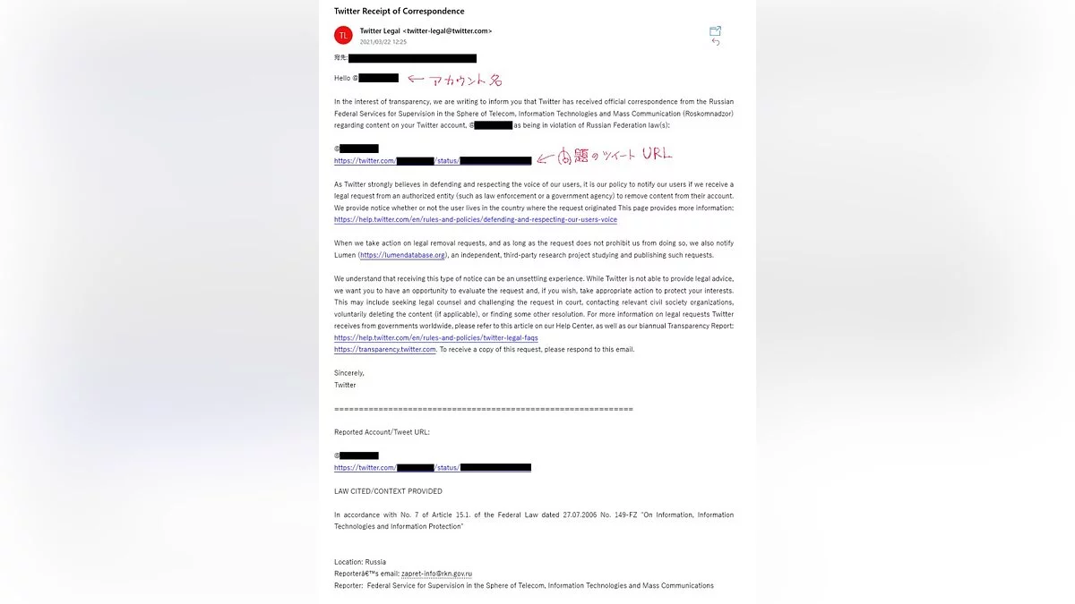 Автор под псевдонимом LiquidMeatBenki сообщил, что получил от Twitter письмо, где сервис, ссылаясь на российские законы, сообщает, что Роскомнадзор пожаловался на его контент. Если верить сообщению, то Twitter не обязует пользователей из других стран следовать требованиям госоргана России, но предлагает обратить внимание на жалобу.