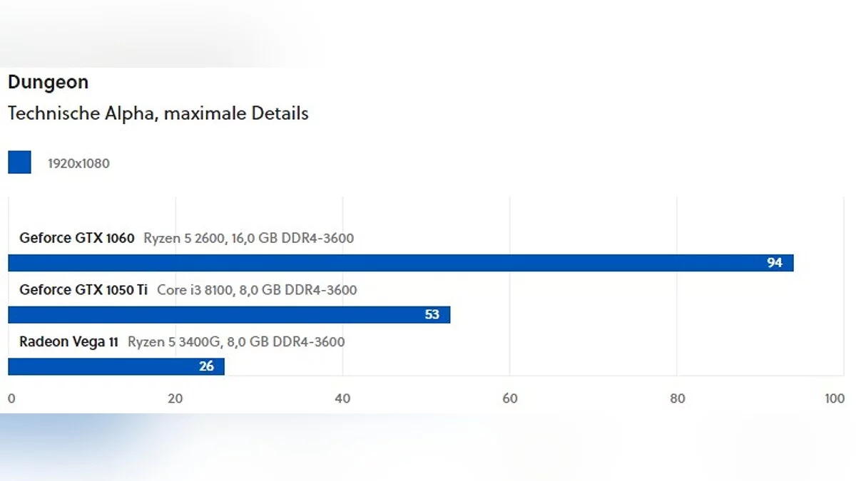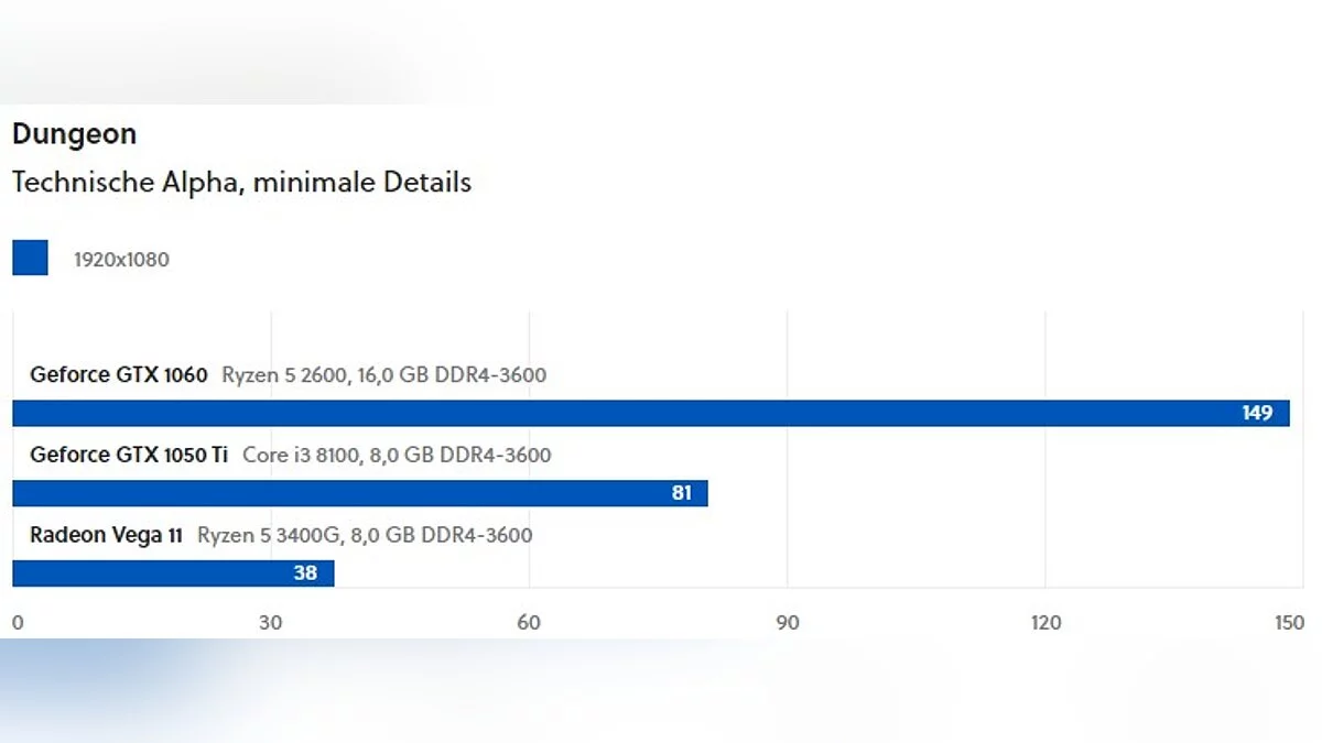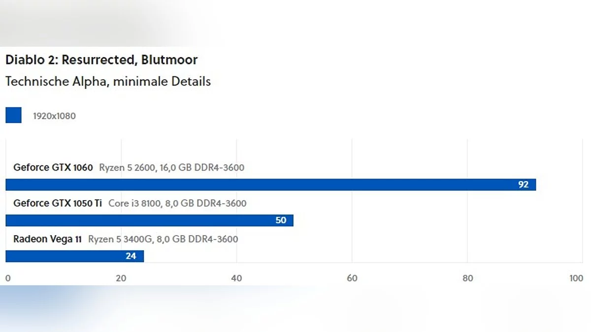 Редакторы немецкого портала GameStar провели тестирование альфа-версии Diablo 2: Resurrected на старых видеокартах. Для этого они взяли три модели: GeForce GTX 1060, GeForce GTX 1050 Ti и Radeon Vega 11 (встроенный в CPU графический процессор). Тестирование проводили в подземелье и на поверхности. Игру запустили в разрешении 1080p.