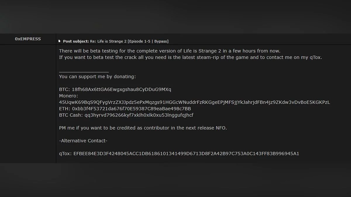 Она сообщила, что начала тестировать новый способ взлома для игры Life is Strange 2. Это продлится около недели. Сама игра начала выходить ещё в 2018 году (последний эпизод появился в декабре 2019-го), однако из пяти эпизодов были взломаны только первые два. При этом дата релиза готовой программы для взлома пока не указана.