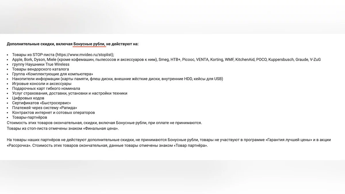 Сеть магазинов «М.Видео» втихомолку обновила собственный «стоп-лист». Теперь, согласно ему, консоли, аксессуары к ним, продукцию компании Apple, а также товары с пометкой «Финальная цена» нельзя купить за бонусные рубли. Об этом сообщается в комментариях в официальном аккаунте сети магазинов в ВК.
