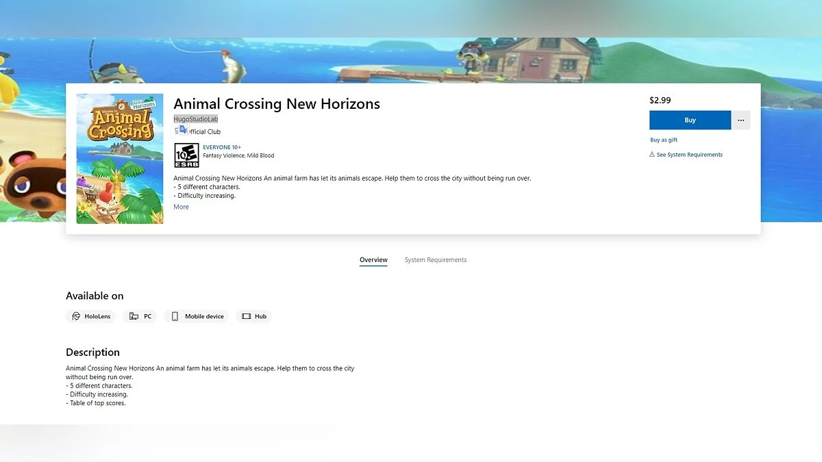 В Microsoft Store появилась игра от HugoStudioLab с тем же названием — Animal Crossing: New Horizons. Заявлено, что она поддерживает PC, мобильные устройства и даже Hololens. При этом новинка даже получила почти официальную обложку. За игру просят 3 доллара.