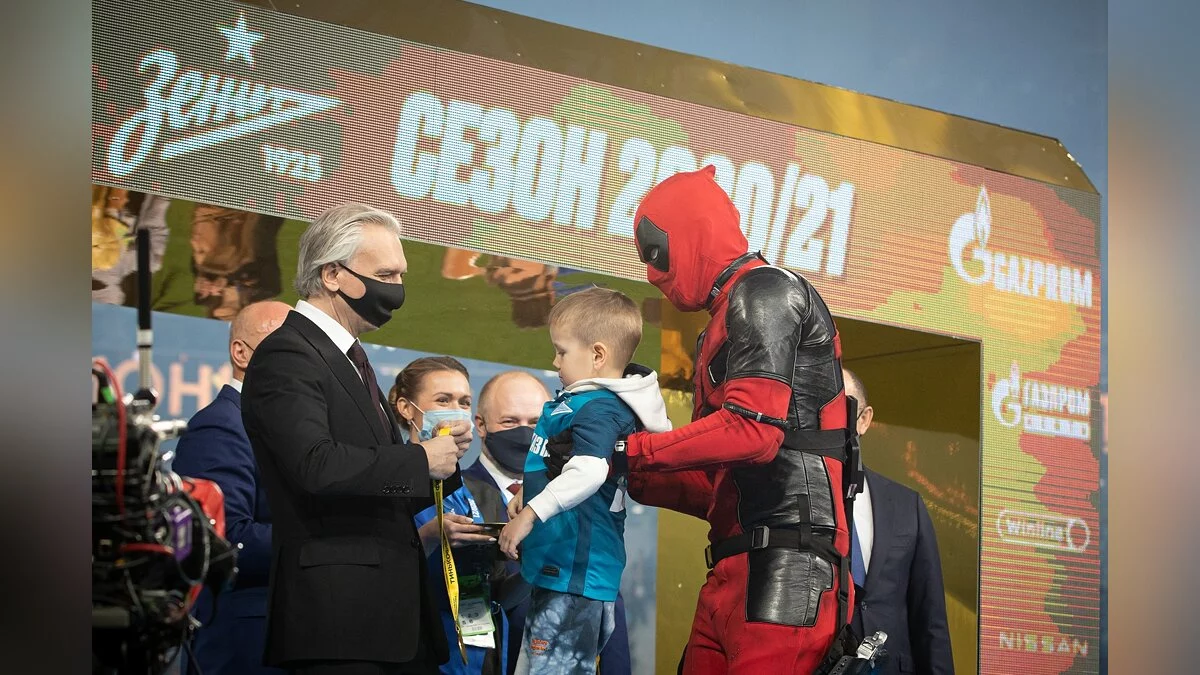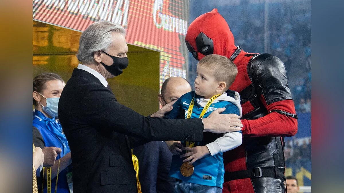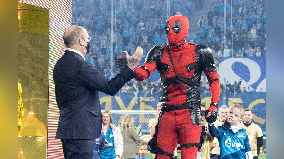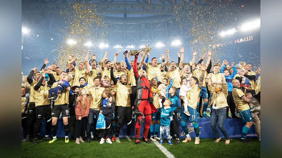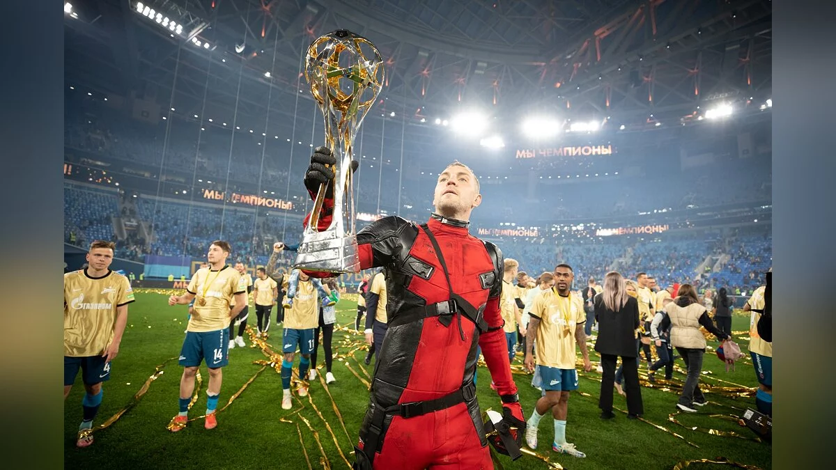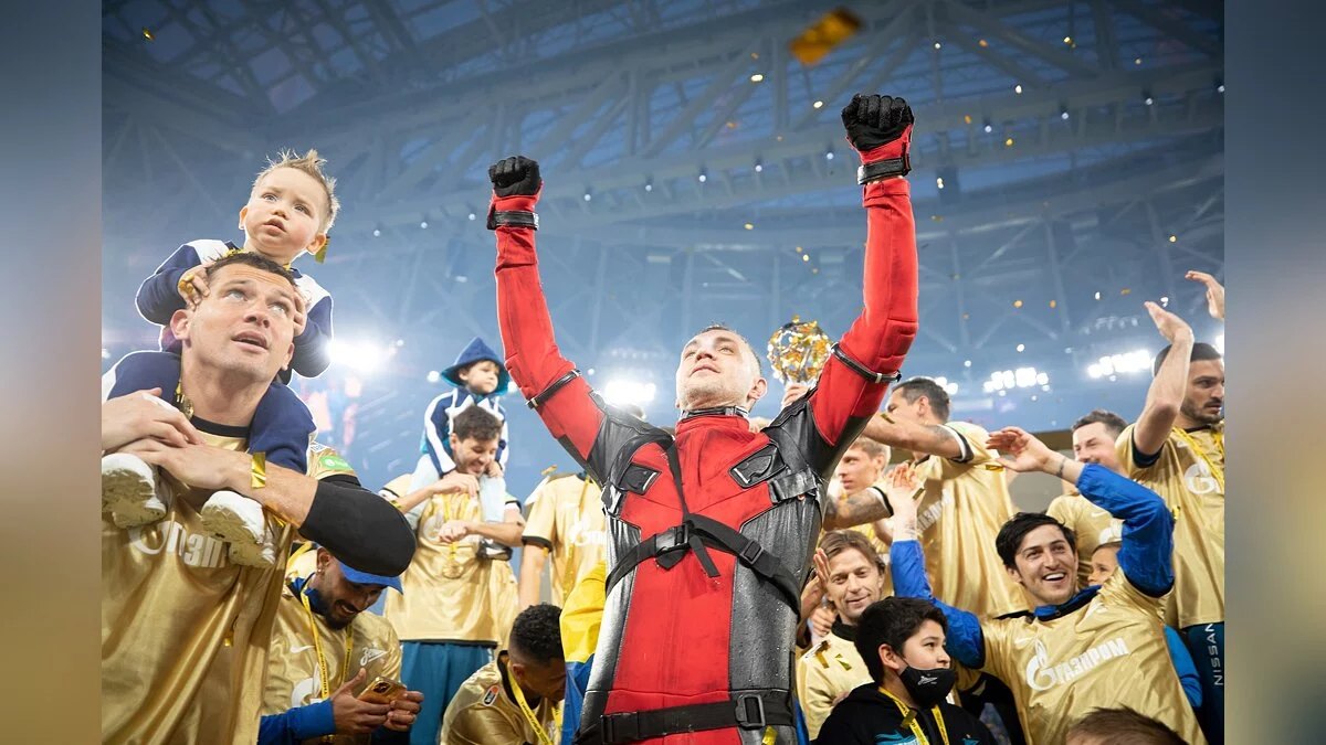 Футболист Артем Дзюба выбежал на поле в костюме Дэдпула. Так нападающий питерского «Зенита» отметил победу клуба в чемпионате России.
