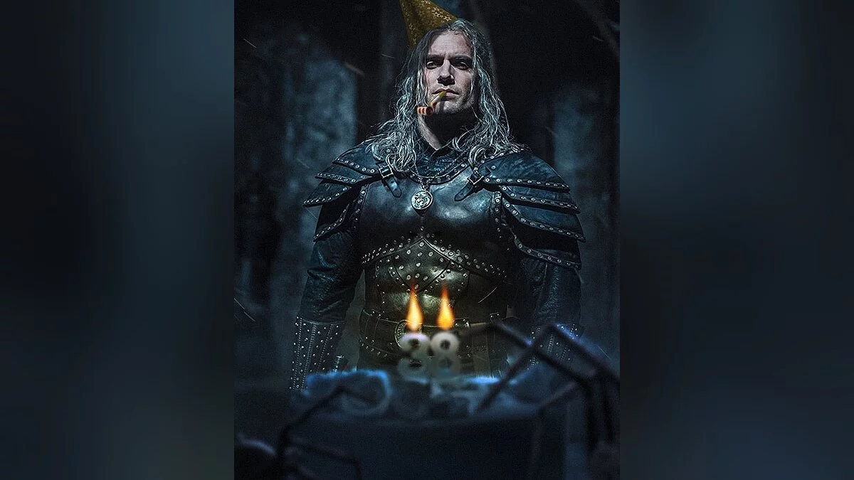 Художник взял (признано в России экстремистской организацией) фотографию Кавилла в образе Геральта и добавил несколько праздничных элементов: торт со свечками, темно-желтый колпак и игрушку во рту. Выглядеть менее брутально герой не стал.