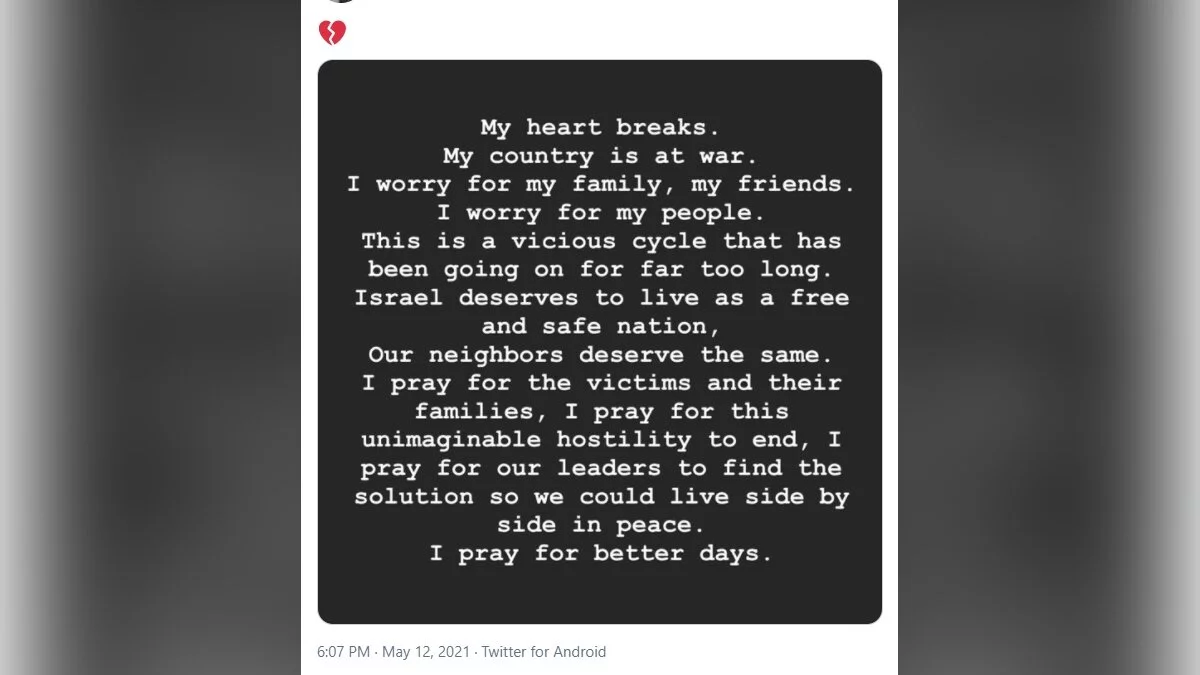 Израильтянка Галь Гадот прокомментировала новое столкновение. Она сообщила, что её «сердце болит», а конфликт «стал порочным кругом, который продолжается слишком долго». Она добавила, что «Израиль заслуживает жить как свободная и безопасная нация, как этого заслуживают и соседи». Гадот отметила, что эта «невообразимая враждебность должна закончиться».