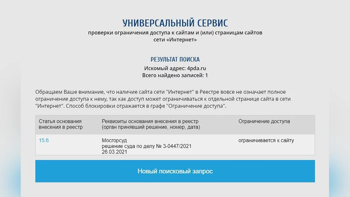 Речь идёт о портале 4pda, решение об ограничении доступа принял Мосгорсуд. Это было сделано в рамках рассмотрения дела № 3-0447/2021 от 26.03.2021.