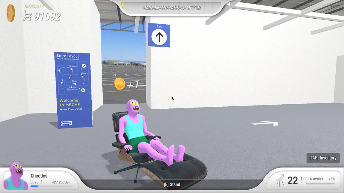 В этой игре вам придётся сидеть, зарабатывать очки и покупать новые стулья. Но не всё так просто — длительное сидение может вызвать дискомфорт и привести к онемению, геморрою, атрофии мышц и, в конечном счете, к смерти.