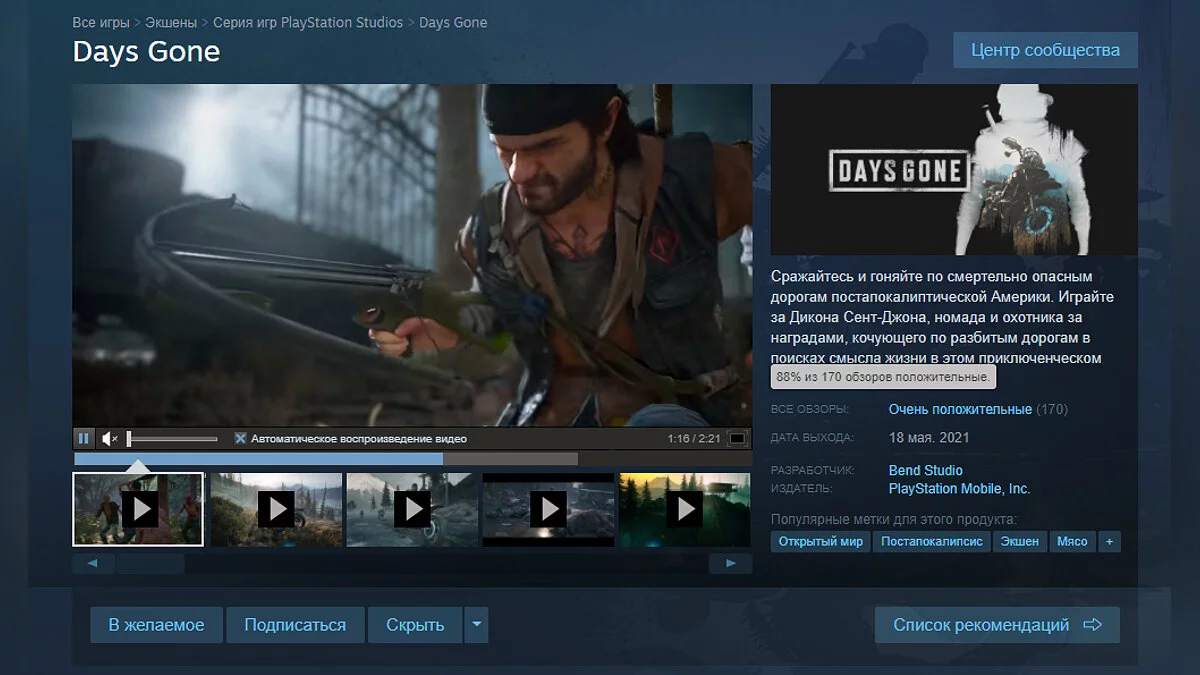 Только что в Steam и Epic Games Store вышел бывший PlayStation-эксклюзив Days Gone, который быстро начал получать положительные отзывы от геймеров. На момент написания новости рейтинг игры составляет 88%.