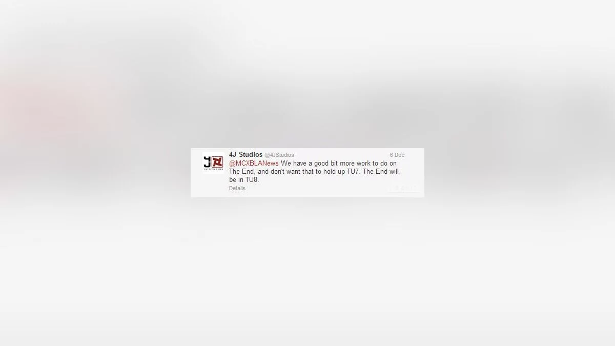 4J Studios на своей страничке в Твиттере анонсировала седьмое обновление для Minecraft: Xbox 360 Edition. Кроме того, поступило подтверждение, что локация «Край» (The End) станет доступна владельцам консоли с выходом восьмого обновления.