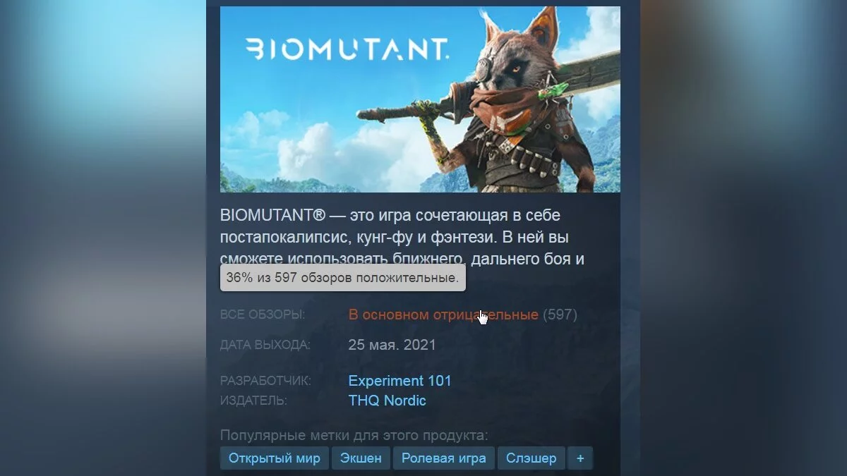 На ПК и консолях состоялся релиз ролевого экшена Biomutant. Игроки оказались не в восторге от новинки. В Steam проект получил «в основном отрицательные» отзывы (36% — положительные, 64% — отрицательные).