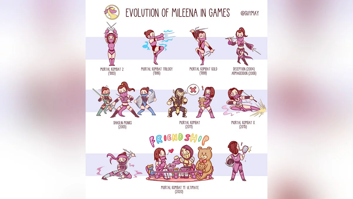 Автором работы выступает пользователь Twitter с ником Guymay. На арте показано, как вели себя Милина в играх, в которых она появлялась:
