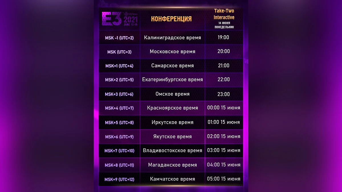 Расписание E3 2021 в картинках для всех часовых поясов. Дата и время ивентов Ubisoft, Xbox & Bethesda, SQUARE ENIX, PC Gaming Show, Take-Two Interactive, Capcom, Nintendo и BANDAI NAMCO